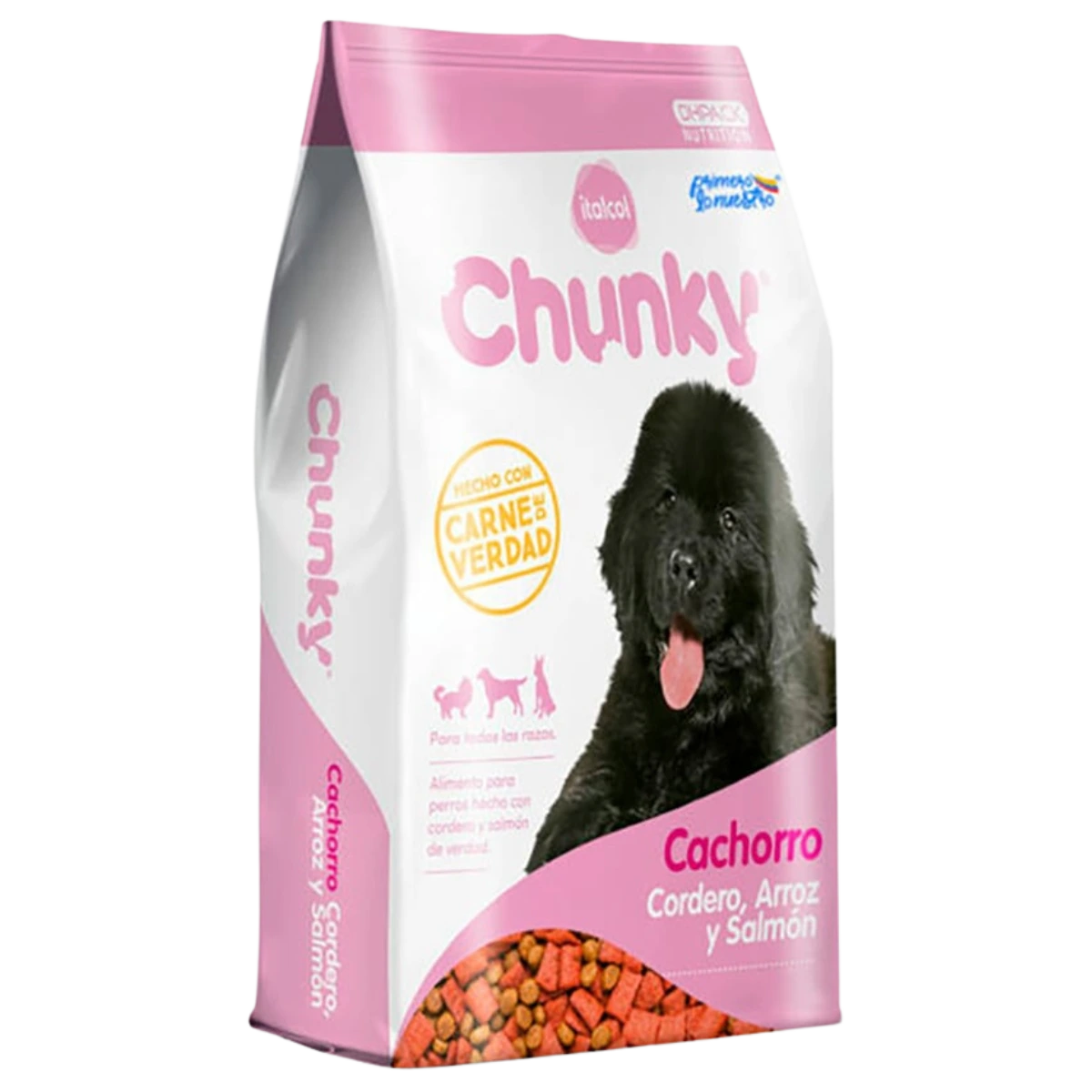 Chunky Cachorro: Nutrición completa con cordero, arroz y salmón. Ideal para cachorros de hasta 1 año. ¡Sabor irresistible y carne real!