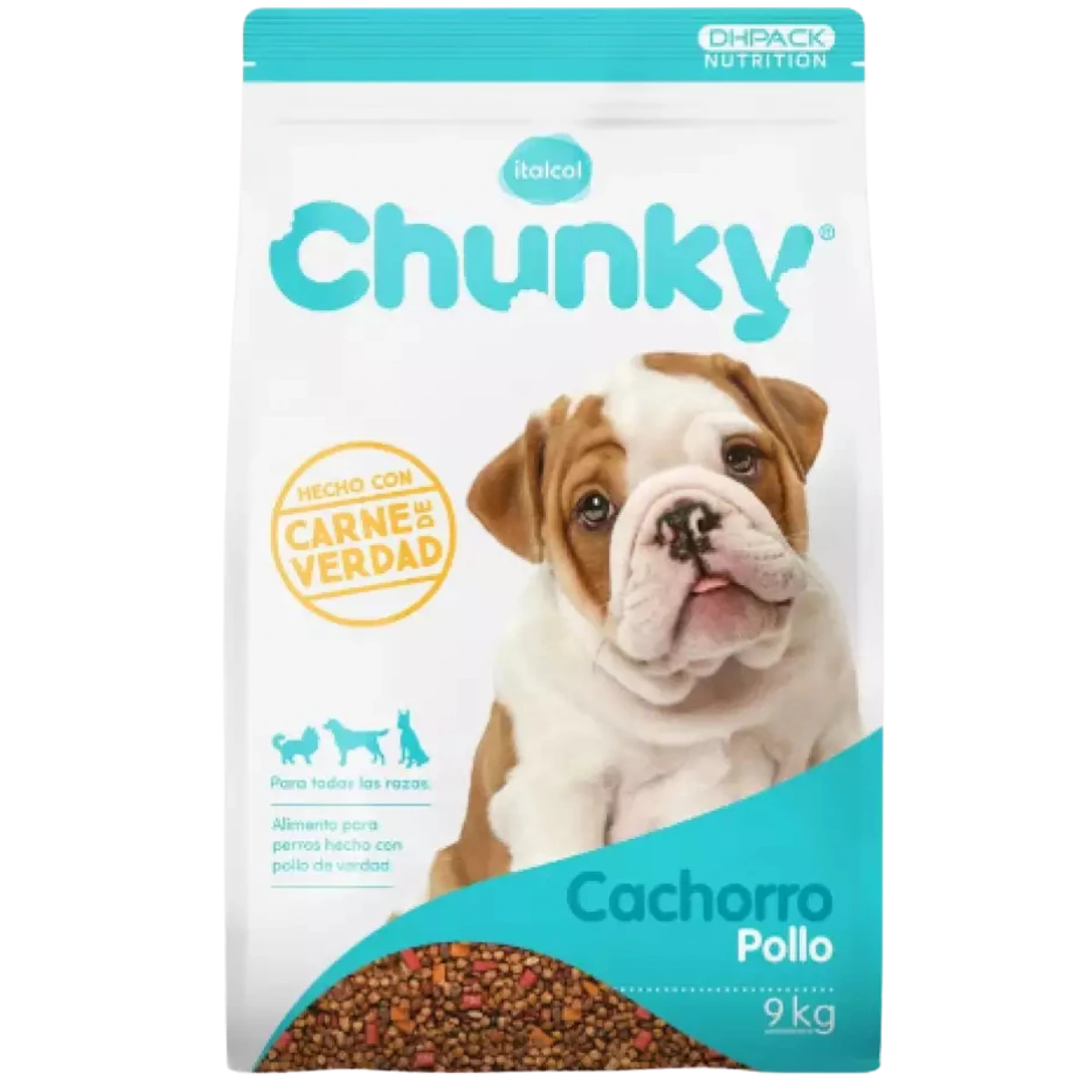 Chunky Cachorros 9 kg: Nutrición completa con sabor a pollo y arroz, ideal para el crecimiento saludable de tus cachorros.