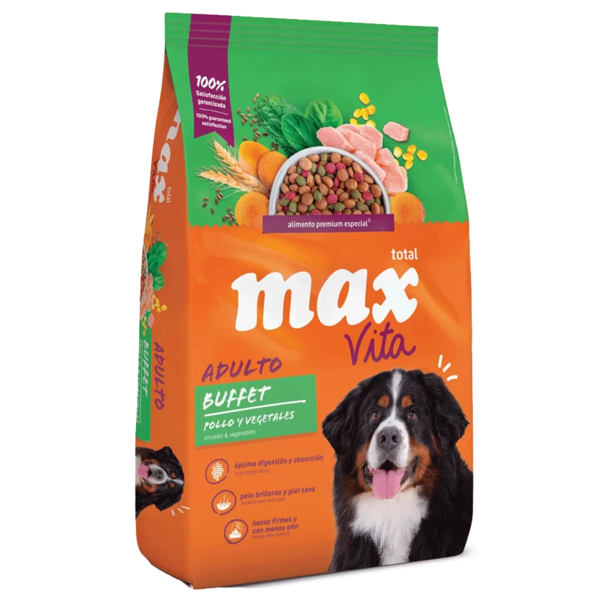 Max Vita Adulto Buffet Frango y Vegetales 8 Kg: nutrición premium 100% balanceada para perros, con excelente digestibilidad y heces firmes.